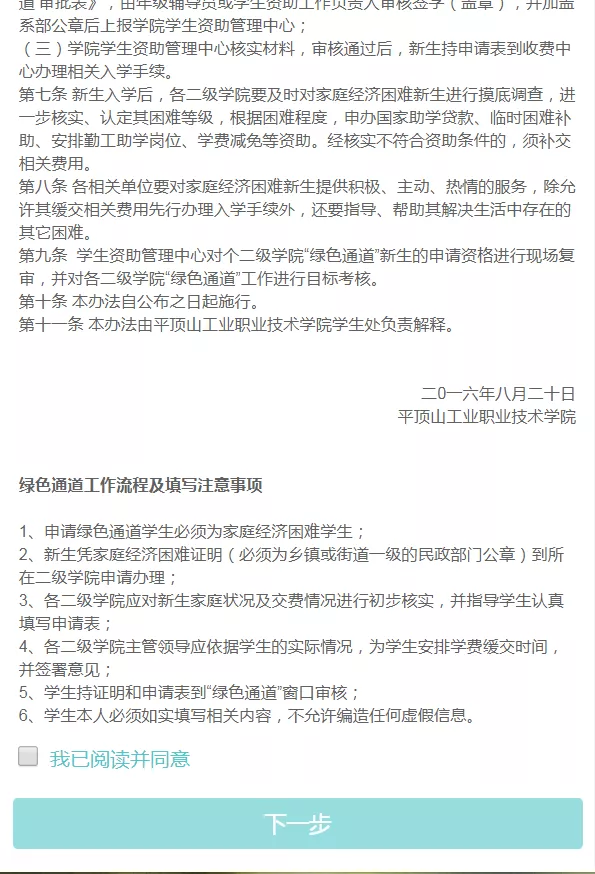 认真阅读《新生绿色通道实施办法》后,选取“我已阅读并同意”,点击下一步进入到信息填写页面。