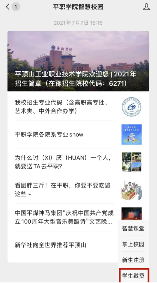 微信扫描《2021新生入学指南》上的二维码,关注“平职学院智慧校园”微信公众号,点击右下角“新生注册”菜单。