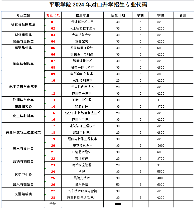 平职学院2024年对口升学招生专业代码